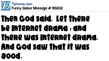 - # 105078 Then God said, “Let there be Internet drama”; and there was Internet drama. And God saw that it was good.