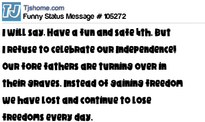 X I will say, Have a fun and safe 4th. But I refuse to celebrate our Independence! Our fore fathers are turning over in their graves. Instead of gaining freedom we have lost and continue to lose freedoms every day.