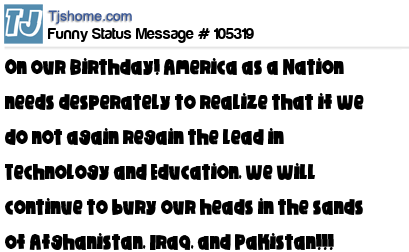 X is On our Birthday! America as a Nation needs desperately to realize that if we do not again regain the lead in Technology and Education, we will continue to bury our heads in the sands of Afghanistan, Iraq, and Pakistan!!!