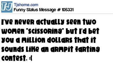 X is I've never actually seen two women "scissoring" but I'd bet you a million dollars that it sounds like an armpit farting contest. :(