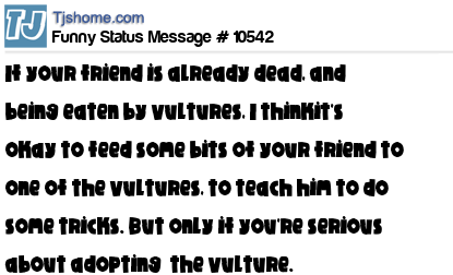 - # 175306 "If your friend is already dead, and being eaten by vultures, I think it's okay to feed some bits of your friend to one of the vultures, to teach him to do some tricks. But only if you're serious about adopting the vulture."