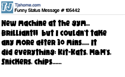 - # 3260 Just been to the gym and there's a new machine there. I only used it for about an hour, as I started to feel sick, but it's great: it's got KitKats, Mars bars, crisps and everything in it