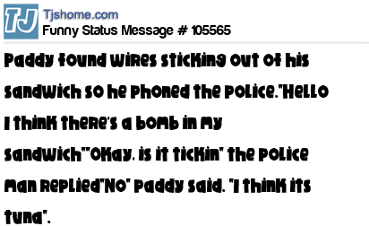 X Paddy found wires sticking out of his sandwich so he phoned the police."Hello I think there's a bomb in my sandwich""Okay, is it tickin" the police man replied"No" paddy said. "I think its tuna".