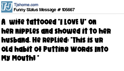 X A wife tattooed "I LOVE U" on her nipples and showed it to her husband. He replied: "This is ur old habit of Putting Words Into My Mouth! "