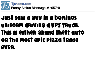 - # 16580 just witnessed a guy in a Dominos uniform driving a UPS truck.. This is either grand theft auto or the most epic pizza trade ever.