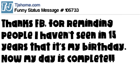 X says Thanks FB, for reminding people I haven't seen in 15 years that it's my birthday. Now my day is complete!!
