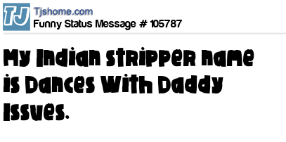X says My Indian stripper name is Dances With Daddy Issues.