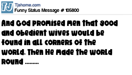 - # 19760 While creating wives, God promised men that good & ideal wives will be found in all corners of the world and then he made the earth round!