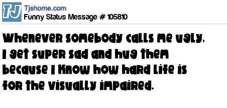 - # 95746 Whenever somebody calls me ugly, I give them a big hug. I can only imagine how hard life must be for the visually impaired.