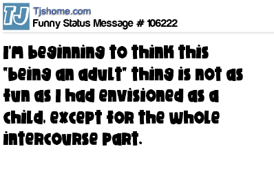 X says I'm beginning to think this "being an adult" thing is not as fun as I had envisioned as a child, except for the whole intercourse part.