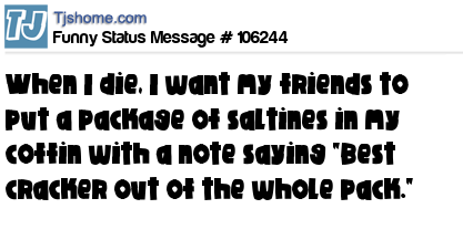 X When I die, I want my friends to put a package of saltines in my coffin with a note saying "Best cracker out of the whole pack."