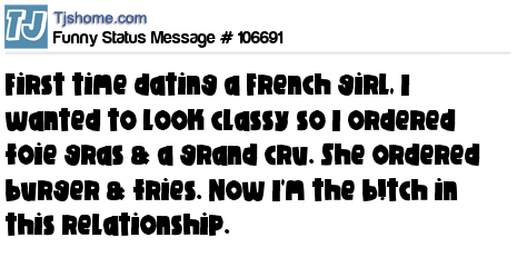 X says First time dating a French girl, I wanted to look classy so I ordered foie gras & a grand cru. She ordered burger & fries. Now I'm the b!tch in this relationship.