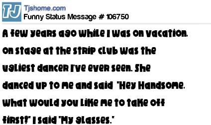 X A few years ago while I was on vacation, on stage at the strip club was the ugliest dancer I've ever seen. She danced up to me and said "Hey Handsome, what would you like me to take off first?" I said "My glasses."