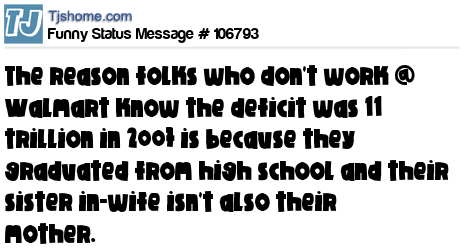 X The reason folks who don't work @ Walmart know the deficit was 11 trillion in 2007 is because they graduated from high school and their sister in-wife isn't also their mother.