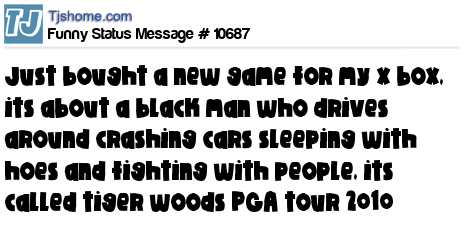 X has just bought a new game for my x box, its about a black man who drives around crashing cars sleeping with hoes and fighting with people, its called tiger woods PGA tour 2010