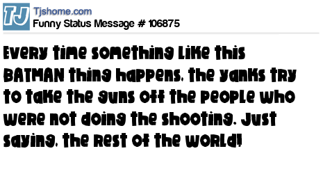 X says Every time something like this BATMAN thing happens, the yanks try to take the guns off the people who were not doing the shooting. Just saying, the rest of the world!