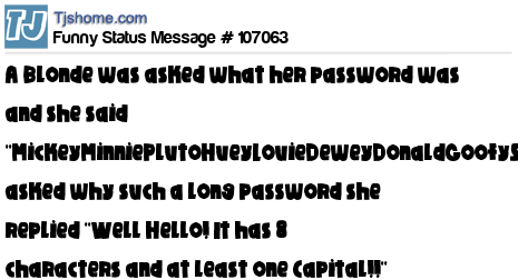 X is A Blonde was asked what her password was and she said ''MickeyMinniePlutoHueyLouieDeweyDonaldGoofySacramento''....When asked why such a long password she replied ''Well Hello! It has 8 characters and at least one Capital!!''