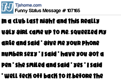 X says In a club last night and this really ugly girl came up to me, squeezed my ar5e and said " give me your phone number sexy " I said " have you got a pen " she smiled and said " yes " I said " well feck off back to it,before the farmer notices your missing