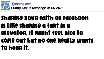 X  Sharing your faith on Facebook is like sharing a fart in a elevator. It might feel nice to come out but no one really wants to hear it.