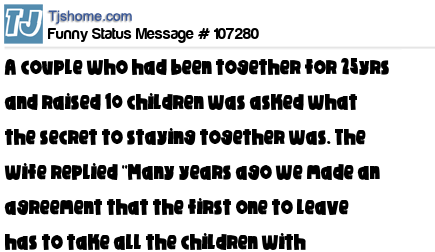 X is A couple who had been together for 25yrs and raised 10 children was asked what the secret to staying together was. The wife replied ''Many years ago we made an agreement that the first one to leave has to take all the children with them!!!''