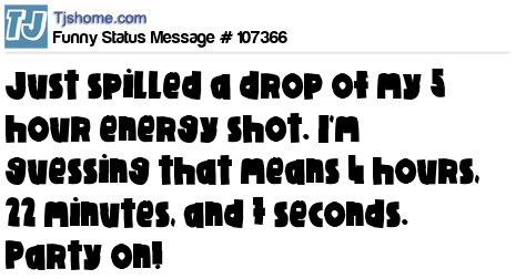 - # 100958 Just spilled a drop of my 5 Hour Energy Shot...I'm thinking 4 hours and 4 minutes now.