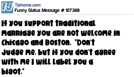 X says If you support traditional marriage you are not welcome in Chicago and Boston. "Don't judge me, but if you don't agree with me I will label you a bigot."