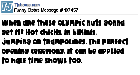 X When are these Olympic nuts gonna get it? Hot chicks, in bikinis, jumping on trampolines. The perfect opening ceremony. It can be applied to half time shows too.