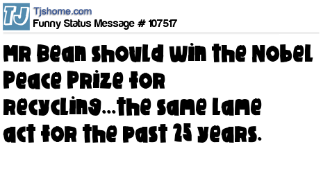 X Mr Bean should win the Nobel Peace Prize for recycling...the same lame act for the past 25 years.