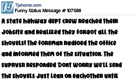 X is A state hghway dept crew reached their jobsite and realized they forgot all the shovels! The foreman radioed the office and informed them of the situation. The suprvsr responded 'Dont worry we'll send the shovels just lean on eachother until they arrive!!
