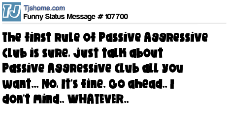 X The first rule of Passive Aggressive Club is sure, just talk about Passive Aggressive Club all you want... No, It's fine. Go ahead.. I don't mind.. WHATEVER..