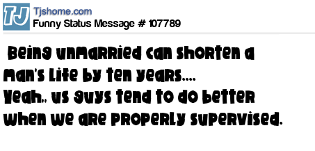 X Being unmarried can shorten a man's life by ten years.... Yeah,, us guys tend to do better when we are properly supervised.