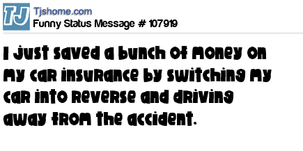 - # 84304 I just saved a bunch of money on car insurance by switching... my car into reverse and driving away from the accident.