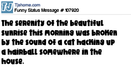 X The serenity of the beautiful sunrise this morning was broken by the sound of a cat hacking up a hairball somewhere in the house.