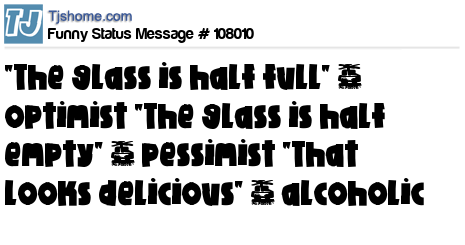 X "The glass is half full" ~ optimist "The glass is half empty" ~ pessimist "That looks delicious" ~ alcoholic