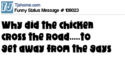 - # 157104 I just seen a chicken cross the road. I'm not even going to question it. It's not like the chicken is going to answer me back. . .