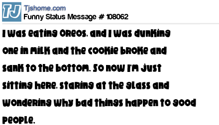 X is I was eating Oreos, and I was dunking one in milk and the cookie broke and sank to the bottom. So now I'm just sitting here, staring at the glass and wondering why bad things happen to good people.