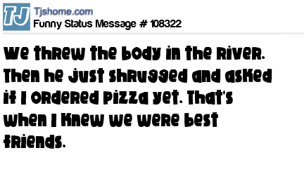 X says We threw the body in the river. Then he just shrugged and asked if I ordered pizza yet. That's when I knew we were best friends.