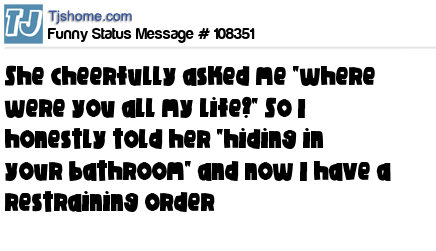 X says She cheerfully asked me "where were you all my life?" So I honestly told her "hiding in your bathroom" and now I have a restraining order