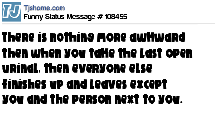 X There is nothing more awkward then when you take the last open urinal, then everyone else finishes up and leaves except you and the person next to you.