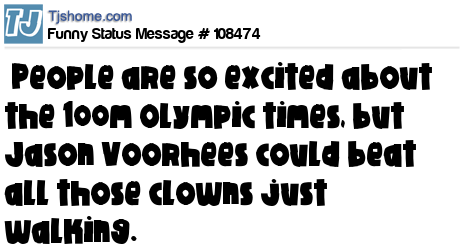 X says People are so excited about the 100m Olympic times, but Jason Voorhees could beat all those clowns just walking.