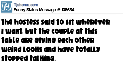 X says The hostess said to sit wherever I want, but the couple at this table are giving each other weird looks and have totally stopped talking.