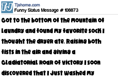 - # 34562 got to the bottom of the mountain of laundry and found my favorite sock I thought the dryer ate. Raising both fists in the air and giving a Gladiatorial roar of victory I soon discovered I washed my wallet.....