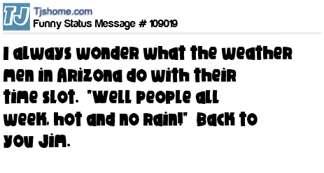 X I always wonder what the weather men in Arizona do with their time slot. "Well people all week, hot and no rain!" Back to you Jim.