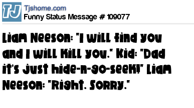 X Liam Neeson: "I will find you and I will kill you." Kid: "Dad it's just hide-n-go-seek!" Liam Neeson: "Right. Sorry."