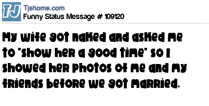- # 164773 My wife got naked and asked me to "Show her a good time." So I showed her Facebook photos of me with my friends before we got married.