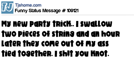 - # 82476 My new party trick.. I swallow two pieces of string and an hour later they come out of my a$$ tied together..... I sh!t you knot."