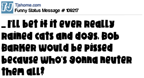X _ I'll bet if it ever really rained cats and dogs, Bob Barker would be pissed because who's gonna neuter them all?