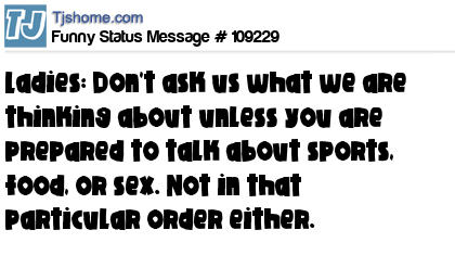 X  Ladies: Don't ask us what we are thinking about unless you are prepared to talk about sports, food, or sex. Not in that particular order either.