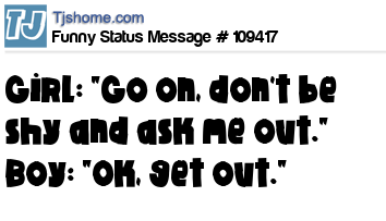 X says Girl: "Go on, don't be shy and ask me out." Boy: "Ok, get out."