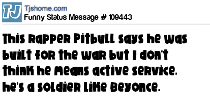 X says This rapper Pitbull says he was built for the war but I don't think he means active service, he's a soldier like Beyonce.